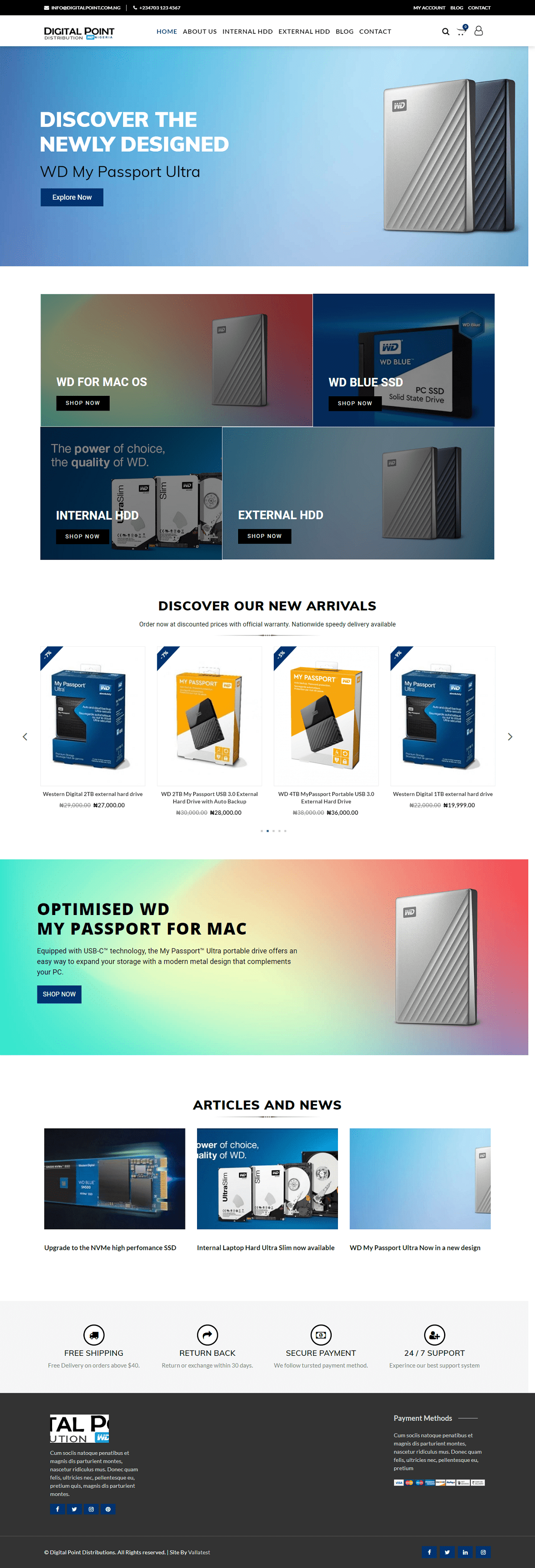 We designed and developed the official website of Digital Point Distribution, which is the outlet of Western Digital (WD) in Nigeria. The bespoke website which is currently been finalised has several features designed to and functionalities designed to promote the brand to the reach millions of Nigerians and beyond and also handle products distributions and sales at all stages.